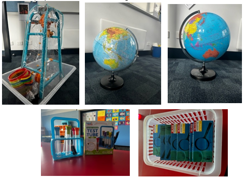 A weather station to help understand the path water takes on Earth. Two world globes, test tubes to aid with scientific experiments and a class set of magnifying glasses to support students Inquiry and Science based learning.