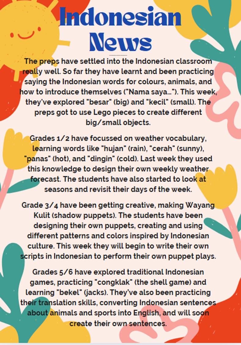 This year, the Prep-2 students will be doing Performing Arts for the first semester (i.e. in Terms 1 and 2), and Digital Technologies in the second semester (i.e. in Terms 3 and 4). The students in years 3-6 will do Performing Arts in the second semester, as they are doing Digital Technologies now and next term. The 3 strands of Performing Arts, i.e. Music, Dance and Drama will be taught over 2 terms for all students, so they will experience approximately 6 weeks of each strand.